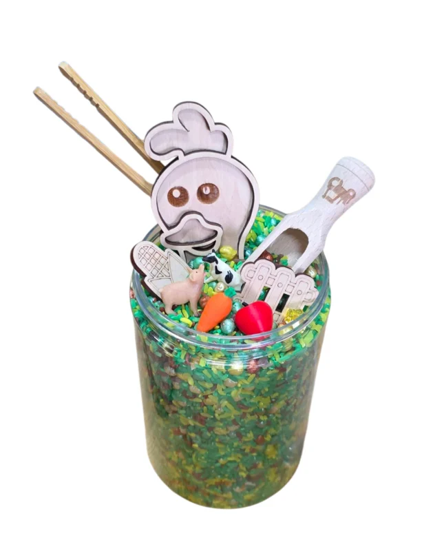 De kikkererwten en Pasta worden geverfd met niet giftige acrylverf. De speelrijst word gekleurd met azijn en voedselkleurstof. De inhoud kan iets variëren maar altijd voldoende voor eindeloos speelplezier! De Mixen worden geleverd in een mooie herbruikbare Pet pot met schroefdeksel.